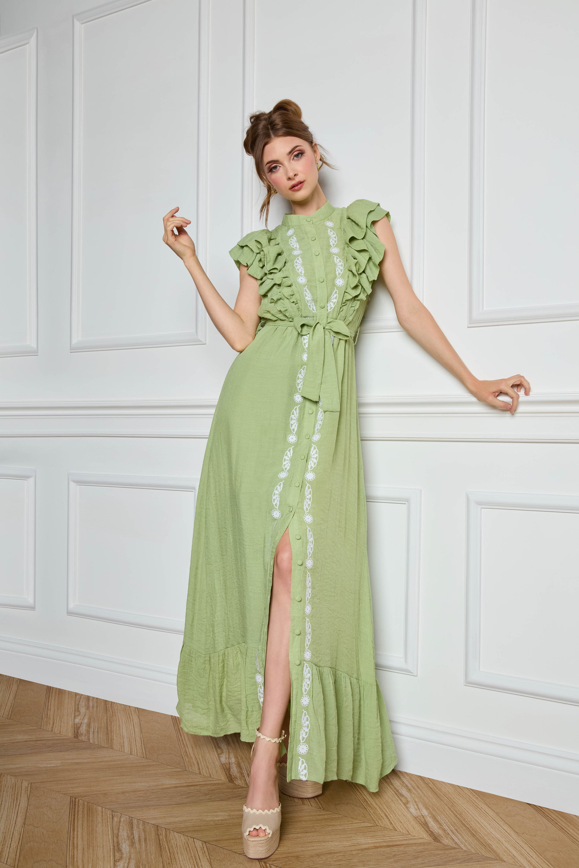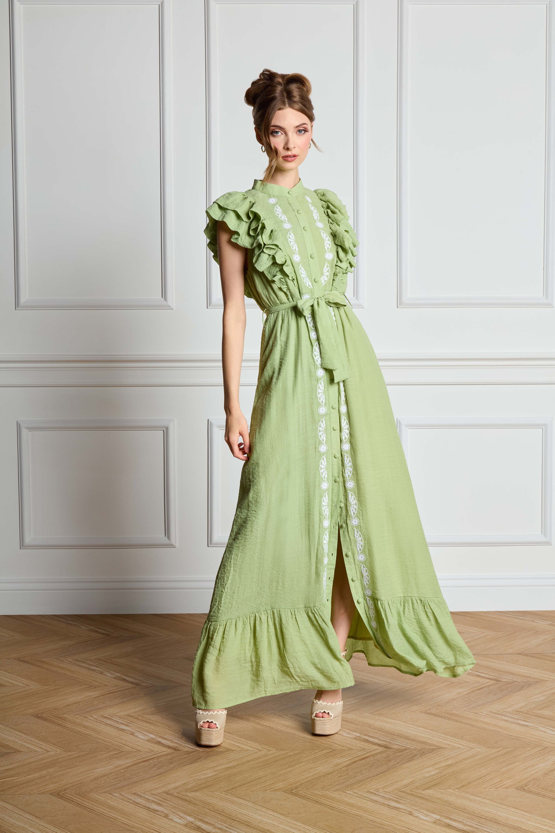 Gorgeous ruffles and embroidery complement a subtle A-line silhouette created with a self-tie belt. Light and airy, this is the perfect dress for every event on your calendar!